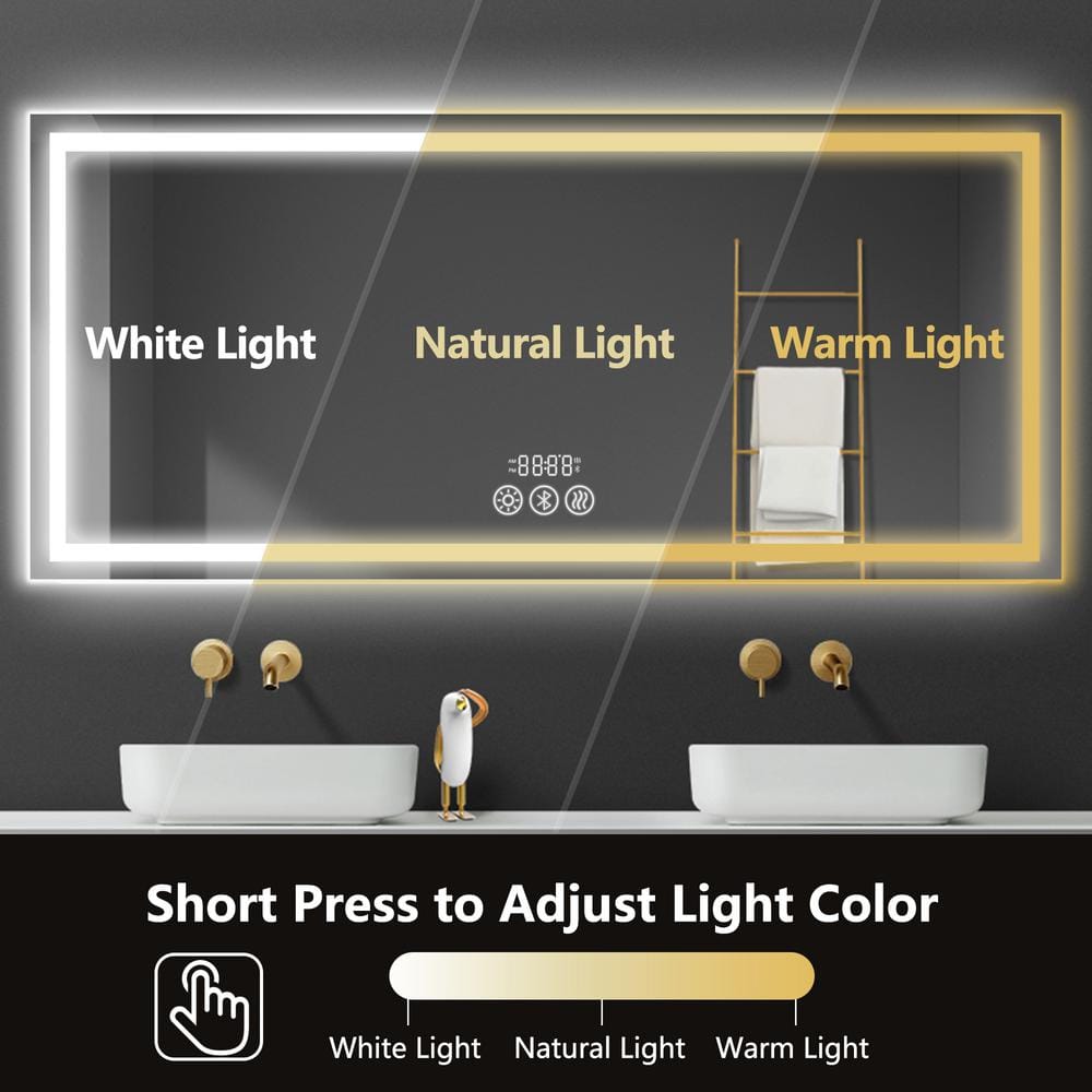 Introducing our tempered LED wall mirror -Aria,which is the perfect addition to elevate your bathroom or bedroom. Featuring shatterproof tempered glass, this LED mirror has touch buttons to conveniently adjust color temperature, brightness, and activate Bluetooth and defogging functions. The large mirror is perfect for checking your makeup or outfit before heading out.
